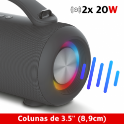 Coluna Bluetooth (3.5" - 2x 20W) • Som potente e cristalino >80dB • Resistência a salpicos IPX5, perfeito para a praia, piscina, barco e outras actividades ao ar livre • Colunas de 3.5" (8.9cm) •