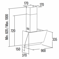 Painel de Controle Tátil com display digital, temporizador de desconexão automática e indicador de limpeza de filtros 4 níveis de extração 3 + 1 TURBO Capacidade de extração máxima ? mínima (Reg.(UE) nº65/2014) 428 m3/h - 170 m3/h Nível sonoro (Reg.(UE) nº65/2014): 50 dB(A), máximo: 64 dB(A) Motor Brushless. Extra silencioso. Consumo máximo de energia 73W Iluminação de alta eficiência por TIRA LED COMPACTA regulavel na intensidade Classe energética: A+ Dimensões (axlxp) 820-1000x900x370mm