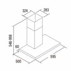 Painel de Controlo Mecânico 3 níveis de extração apacidade de extração máxima ? mínima (Reg.(UE) nº65/2014) 302 m3/h - 165 m3/h Nível sonoro (Reg.(UE) nº65/2014): 58dB(A), máximo: 62 dB(A) Consumo máximo de energia 65W Iluminação de alta eficiência por TIRA LED Classe energética: C Dimensões (axlxp) 548-998x595x500mm