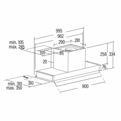 Painel controlo eletrónico com temporizador de desconexão automática 4 níveis de extração, 3 + 1 turbo Caoacidade de extração máxima - mínima: 850 - 340m3/h Nível sonoro: 50dB, máximo 65dB Motor BT3 Extra silencioso Consumo máximo de energia 283W Iluminação LED Sistema de fácil instalação Filtros em inox laváveis Vidro de proteção Acabamento em inox Pressão máx.: 450Pa - Pressão TURBO: 470Pa Descarga 150/125mm Classe de eficiência energética: A Dimensões (axlxp): 334x995x310-350mm