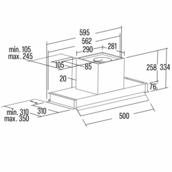 Painel de Controle eletrônico com temporizador de desconexão automática 3 níveis de extração 2+ 1 TURBO Capacidade de extração máxima ? mínima (Reg.(UE) nº65/2014) 850 m3/h - 340 m3/h Nível sonoro (Reg.(UE) nº65/2014): 50 dB(A), máximo: 65 dB(A) Motor BT3. Extra silencioso. Consumo máximo de energia 280W Iluminação de alta eficiência por TIRA LED Classe energética: A Dimensões (axlxp) 334x595x310-350mm