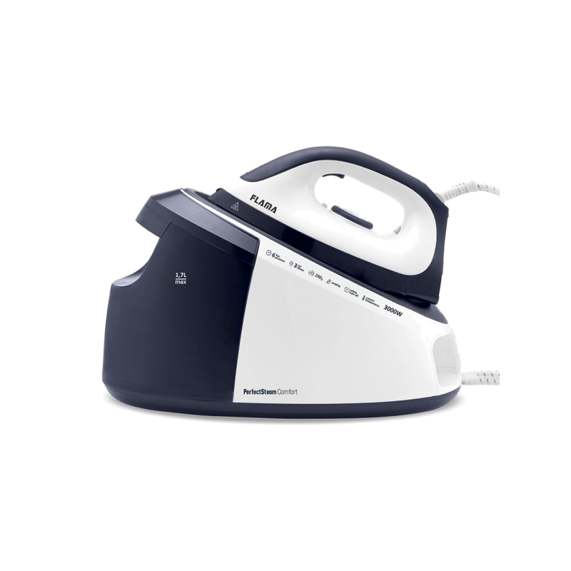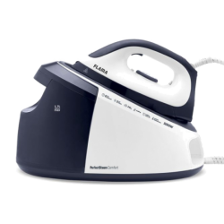 Capacidade depósito: 1,7L Cor: Branco e azul Potência máxima: 3000W Débito de vapor: 120g/min Vapor constante: Horizontal e vertical Tipo de base: Base cerâmica Termóstato regulável Depósito de água amovível Jato de vapor: 240 g