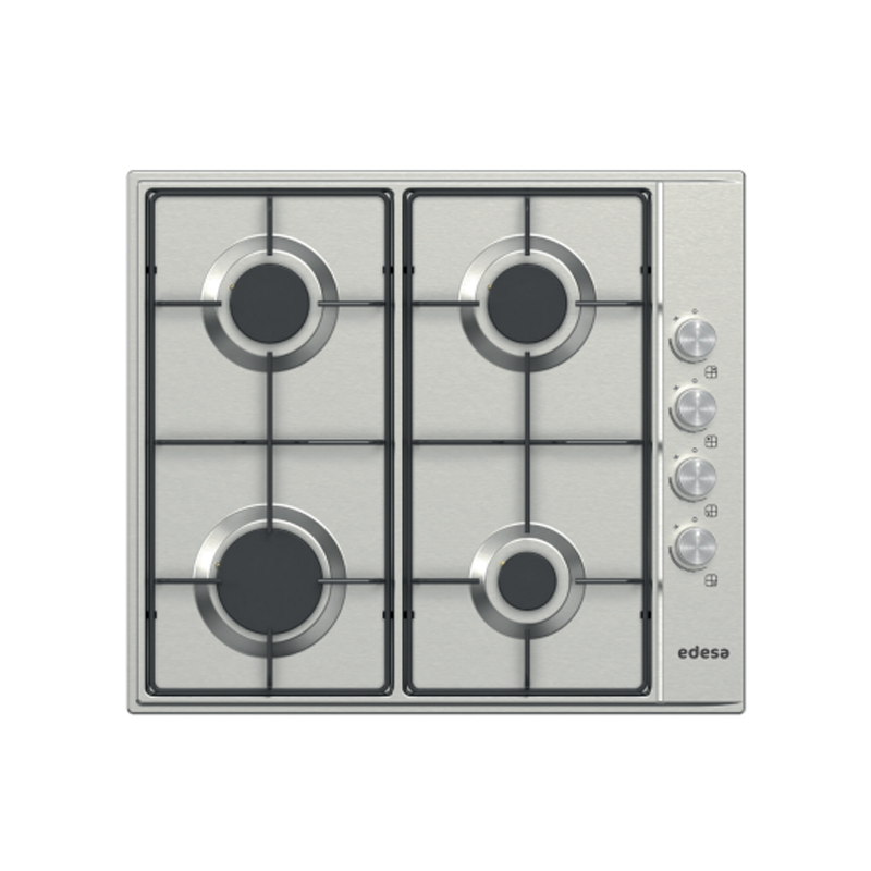 Largura: 58cm Placa de gás butano com 4 bocas 2 grelhas independentes sobre superfície de aço inoxidável Uma rápida, duas semi-rápida e uma auxiliar Ligação eletrónica integrada em comando Sistema de segurança de corte de gás Potência total gás: 7,5 kW Cor: Inox Dimensões (axlxp): 48x580x510mm