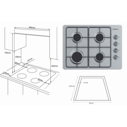 Cor: Inox Dimensões: 9,5x58x43,5cm Tipo de placa: Gás Zonas de cozedura: 4 zonas - rápido: 1x3,00kW - semirápido: 2x1,75kW - auxiliar: 1x1,00kW Largura: 58 CM Segurança termopar Superfície de cozedura em aço inoxidável Queimadores desmontáveis Limpeza fácil Inclui kit para gás natural